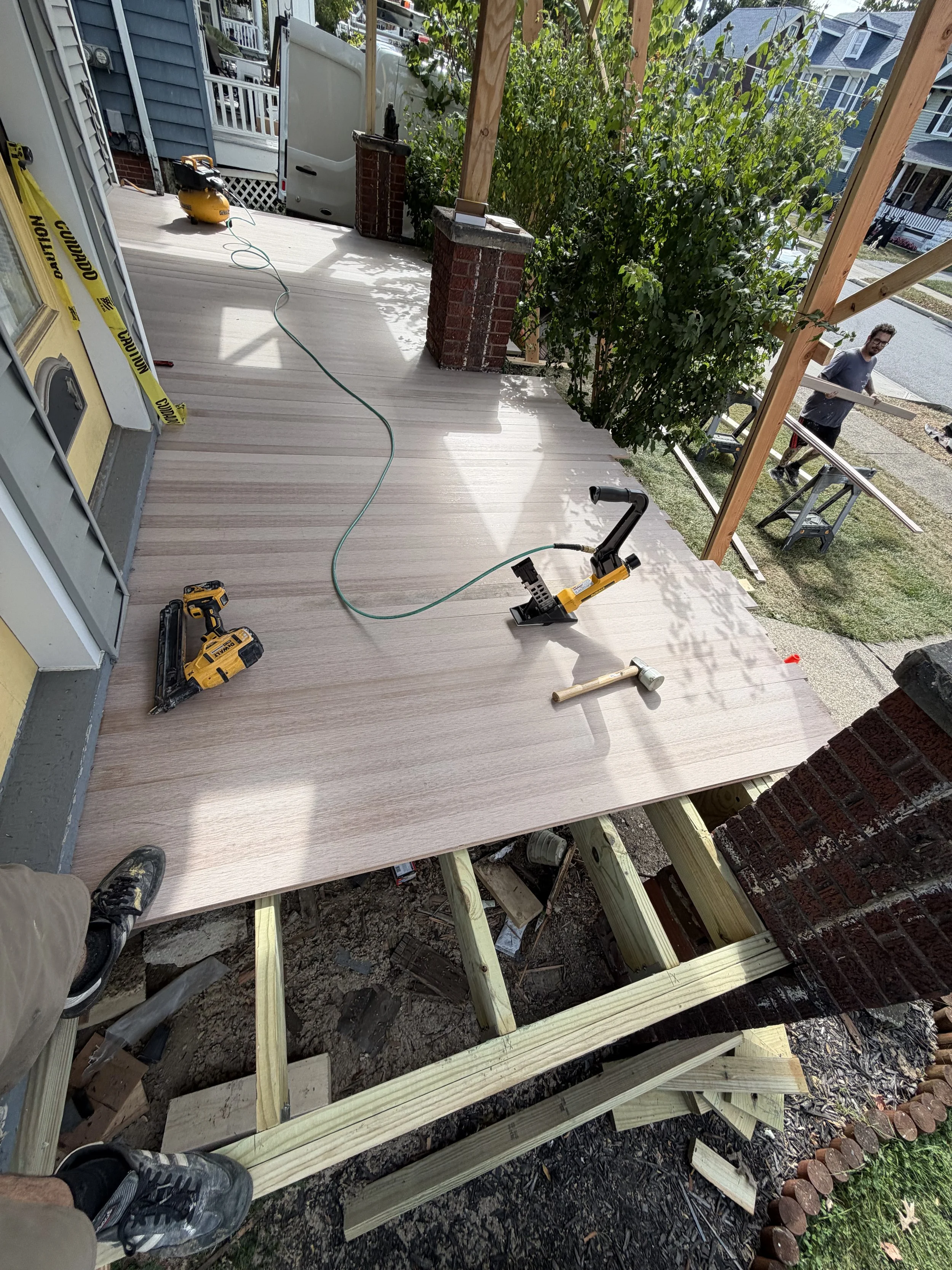 After these steps, we began re-framing the front lower porch and installed the flooring—ACRE by Modern Mill floors are PVC and corn husks, so the flooring can be stained later. It mimics the look of red oak somewhat, and it’s a great choice for a lasting porch floor to withstand the elements of Cleveland weather.